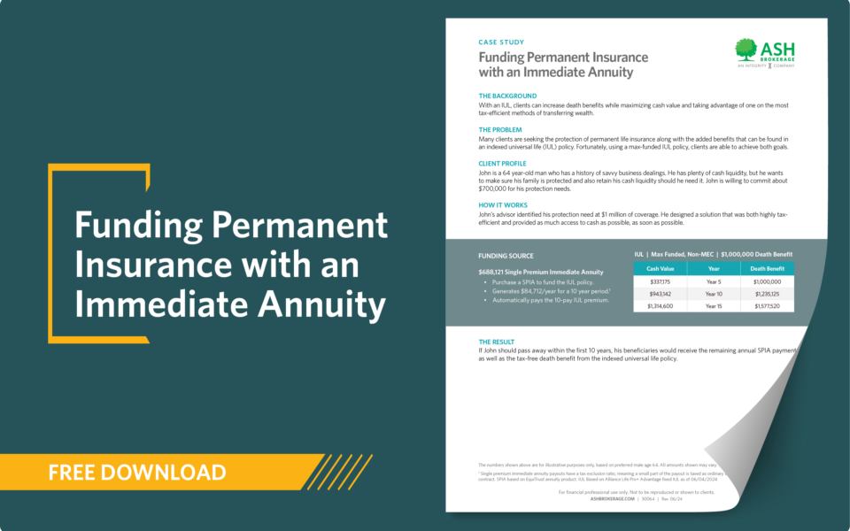 Here's a funding solution for clients who seek the protection of permanent life insurance, with the added benefits of an indexed universal life. Using a SPIA to fund the IUL, they can potentially increase death benefits while maximizing cash value for withdrawal opportunities.