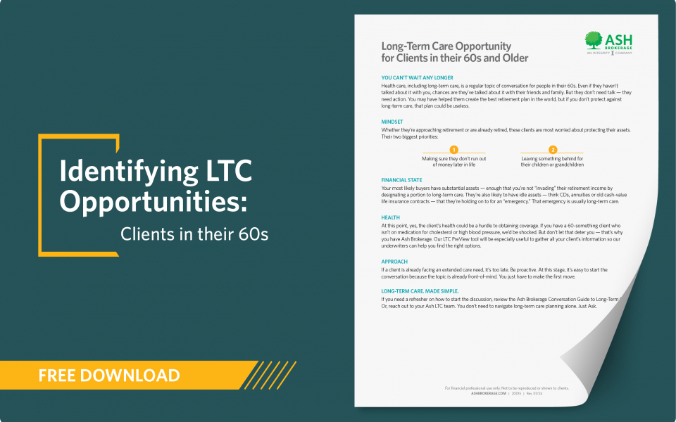 Health care, including long-term care, is a regular topic of conversation for people in their 60s. It comes up around the dinner table. And it needs to come up in your planning conversations. But these clients don’t just need talk – they need action. Help them create an LTC plan.