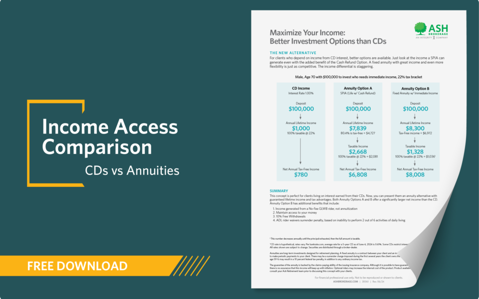 For clients who rely on interest from CDs for retirement income, annuities may provide a better alternative. A single premium immediate annuity (SPIA) with a full return of premium (ROP) rider can generate significantly more annual lifetime income. In this example, 6x higher!