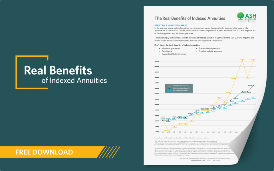 In years when the S&P 500® Index is negative, fixed indexed annuities (FIAs) can be a client's hardest-working asset. Supported by a minimum guarantee, FIAs provide opportunity to accumulate value on the appreciation of the S&P, without losing premium when the S&P was negative.